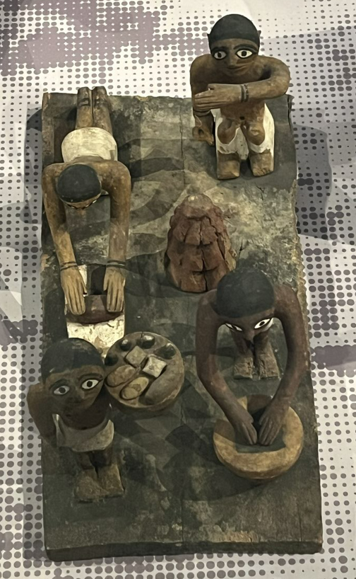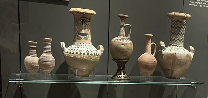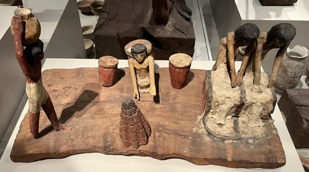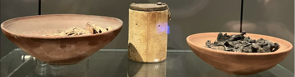 Printre obiectele descoperite se află și mese mici din lemn sau stuf, farfurii, boluri, recipiente pentru păstrat băuturile și sticle pentru transport și consum zilnic.