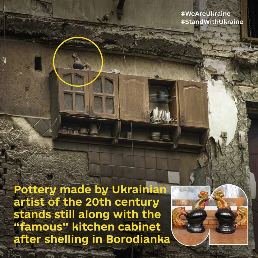 În timpul vizitei primului-ministru britanic la Kiev, Boris Johnson și Volodymyr Zelensky au primit cadou de la o ucraineancă două recipiente din ceramică pentru alcool, în formă de cocoș. Ulciorul a devenit simbolul rezistenței ucrainiene după ce un astfel de obiect a rezistat unui atac rus dintr-un sat de lângă Kiev.